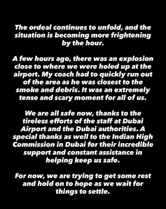 多亏了迪拜机场工作人员和迪拜当局的不懈努力,我们现在都安全了。特别感谢印度驻迪拜高级专员公署,他们为保障我们的安全提供了令人难以置信的支持和持续的协助。