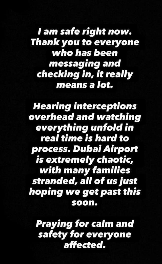 亲眼目睹一切实时发生,这让人难以接受。迪拜机场一片混乱,许多家庭滞留在此,我们所有人都只希望能尽快度过这场危机。